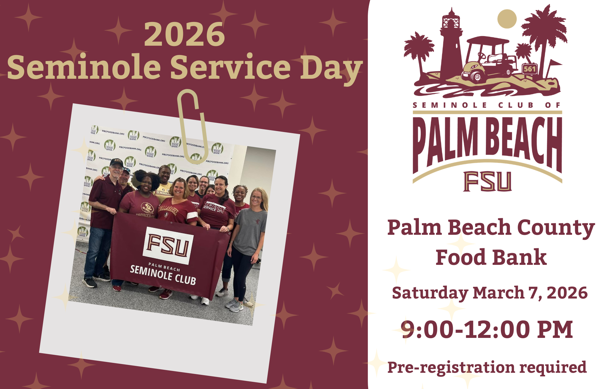 The Palm Beach Seminole Club invites you to participate in the 2026 Seminole Service Day on Saturday, March 7th from 9:00 AM – 12:00 PM at the Palm Beach County Food Bank.